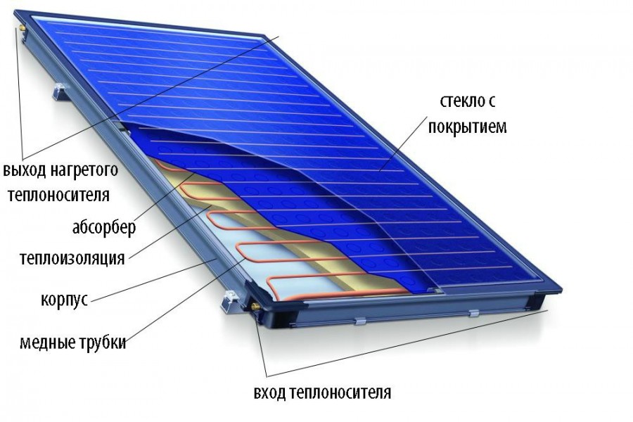 Конструктивно представляет собой панель с площадью поглощающей поверхности 2-2,5 м2, выполненную из алюминиевых или стальных сплавов. Лицевая часть выполнена в виде листа специального гелиостекла, что обеспечивает максимальное поглощение энергии солнечного света и минимальные потери энергии с отраженными и рассеянными лучами. Непосредственно под гелиостеклом расположен поглотитель, выполняемый в виде плоской трубки из медных или алюминиевых сплавов, имеющих высокий коэффициент теплопередачи.
