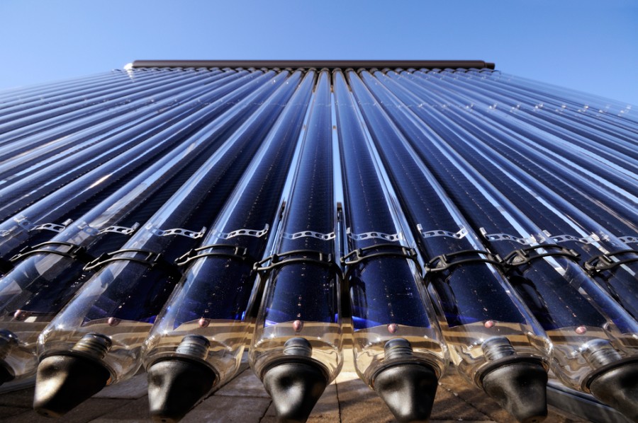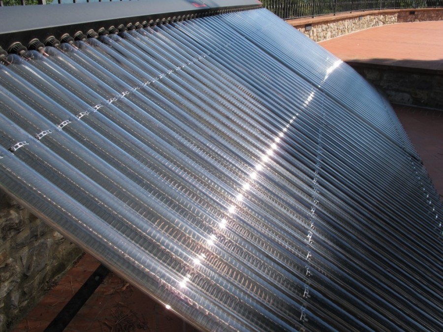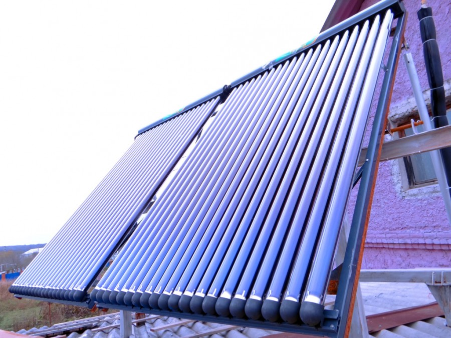 Вакуумный коллектор сложнее по конструкции. Это ряд вакуумных трубок, внутри которых расположены тепловые трубки. Свет проходит сквозь прозрачную поверхность верхних трубок, а вакуум, которым они заполнены, сокращает теплопотери на 95-97%. Внутренние трубки покрыты специальным составом для более эффективного улавливания энергии. Теплоноситель при нагревании превращается в газ, поднимается в верхнюю часть трубки и отдаёт тепло, после чего конденсируется и возвращается вниз, вновь нагревается, становится газом – и так далее.