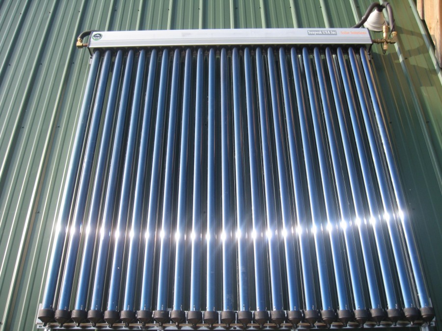 Дорогостоящий вид солнечного коллектора вследствие сложного изготовления и ряда преимуществ перед плоскими солнечными панелями. Конструктивно представляет собой ряд парных стеклянных труб, спаянных между собой, из пространства между которыми откачан воздух. Вакуум в пространстве между трубками является прекрасным тепловым изолятором и предотвращает тепловые потери в окружающую среду от теплоносителя. В меньшую трубу вводится медная, алюминиевая или стеклянная трубка поглотителя. Трубы верхней частью вводятся в распределитель, в котором циркулирует теплоноситель. Вакуумные (вакуумированные) трубчатые коллекторы по типу распределителя подразделяются на два типа: с плоской тепловой трубой и прямоточные.