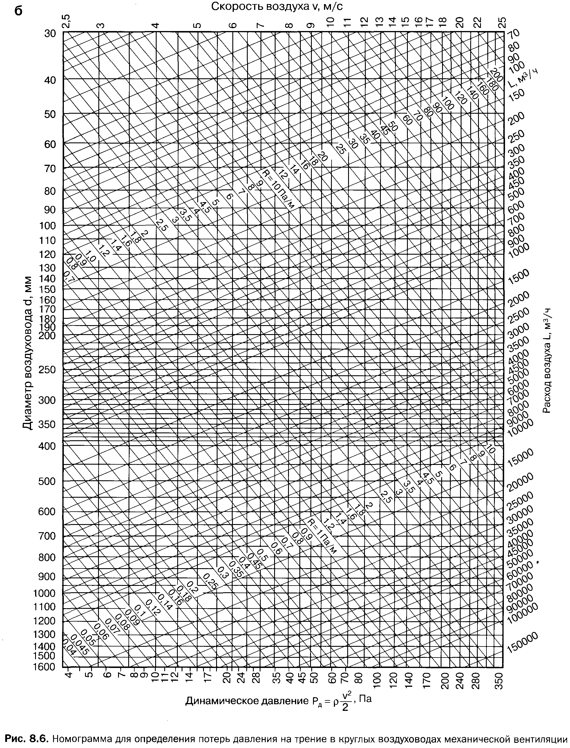 Рис.3.2 Номограмма для расчетов круглых стальных воздуховодов