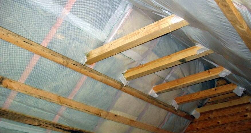 Если расчетная толщина утеплителя больше высоты балок, то дополнительно набиваются деревянные рейки. Они необходимы для создания воздушного зазора. Это актуально при дальнейшем настиле на чердаке полов.