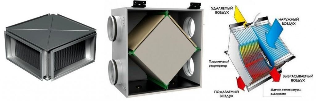 Пластинчатый рекуператор состоит из алюминиевых, пластиковых и изготовленных из специальной бумаги пластин. В некоторых моделях потоки воздуха движутся перпендикулярно друг к другу, в других перемещаются в противоположных направлениях.