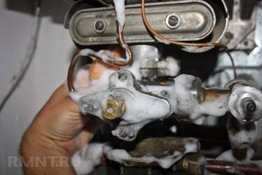 Убедившись в правильности работы газового крана, разжигаем колонку и проверяем герметичность всех газовых соединений мыльным раствором. Если колонку не разжечь — герметичность удастся проверить только до кнопки автоматики.