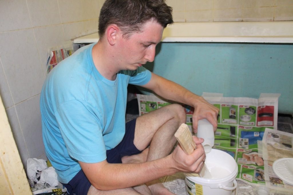 - Повторите все описанное в предыдущем пункте, только теперь лейте акрил с середины глубины ванны. Экономить не стоит. Все излишки соберутся у слива и выльются в подготовленную плошку.