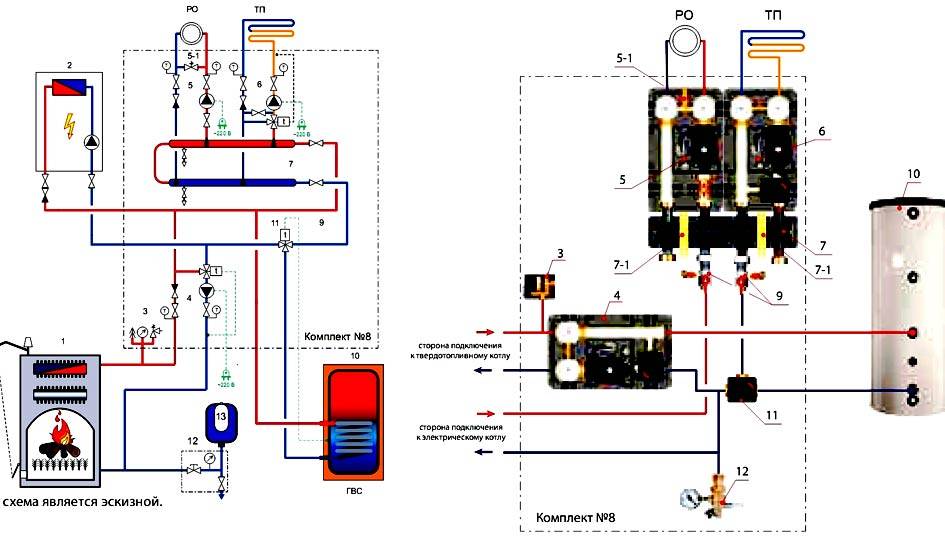 Типичная схема обвязки твердотопливного и электрического котла представлена на рисунке. Подразумевается, что в электрическом агрегате имеется свой циркуляционный насос.