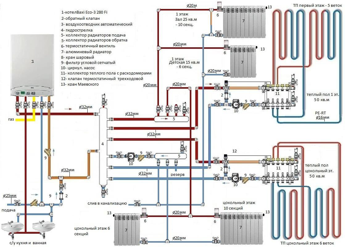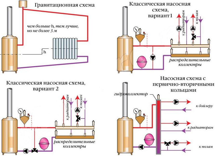 В зависимости от вида выбранного контура отопления (и котла) в ней могут быть и другие составные части.