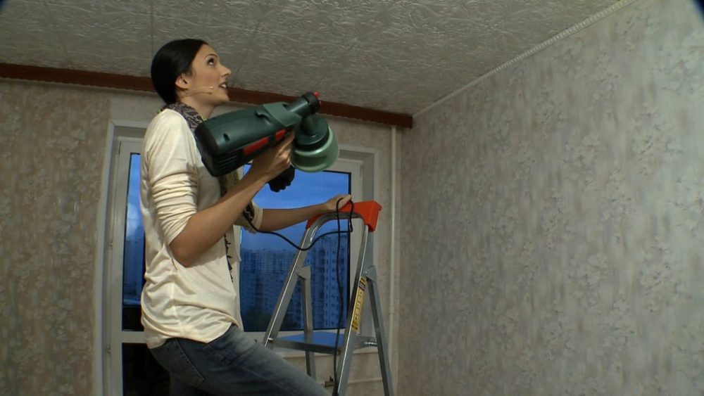 Если это не так, возьмите валик с длинной желательно регулируемой рукояткой или же возьмите на вооружение стремянку. Минус ее использования в том, что Вам понадобится помощник, который будет ее все время держать.