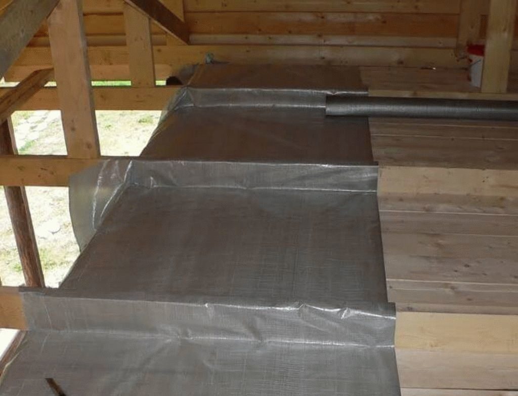 Бетонный потолок перед укладкой утеплителя нужно обработать противогрибковой пропиткой и загрунтовать. Деревянный потолок пропитывают антисептическим составом. На перекрытие кладут пароизолятор, герметизируя стыки.