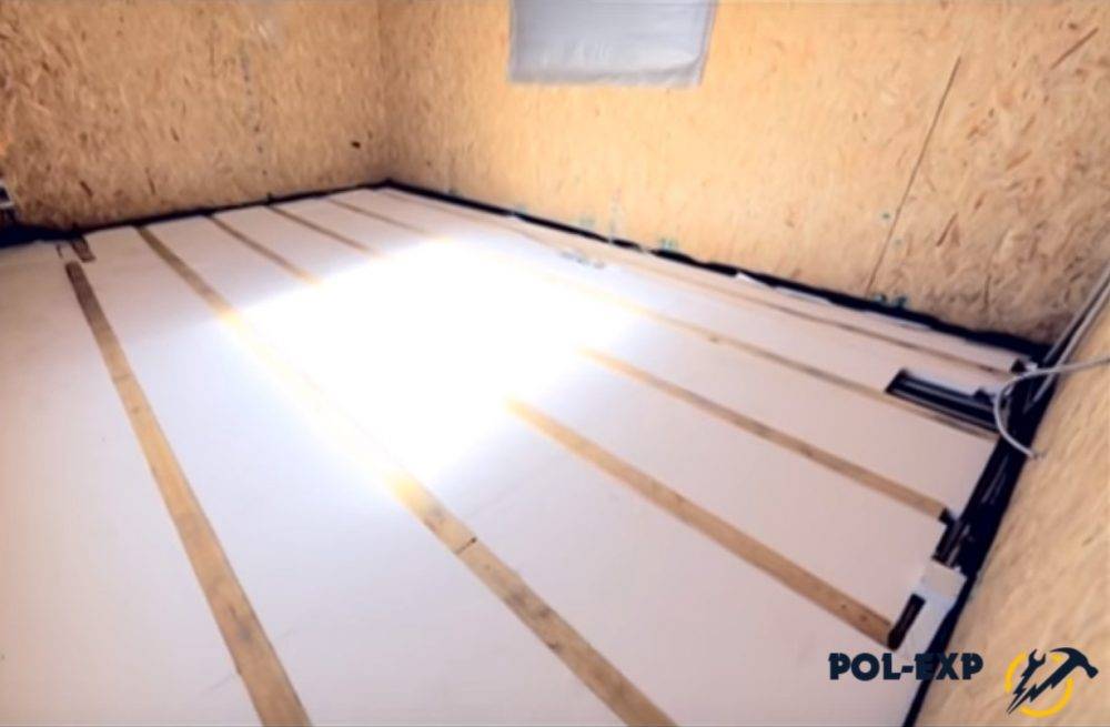 Шаг 5. Затем требуется «зашить» пирог пола фанерными листами, листами ОСБ или же обычной доской. Все, пол готов, можно обустраивать финишное отделочное напольное покрытие.