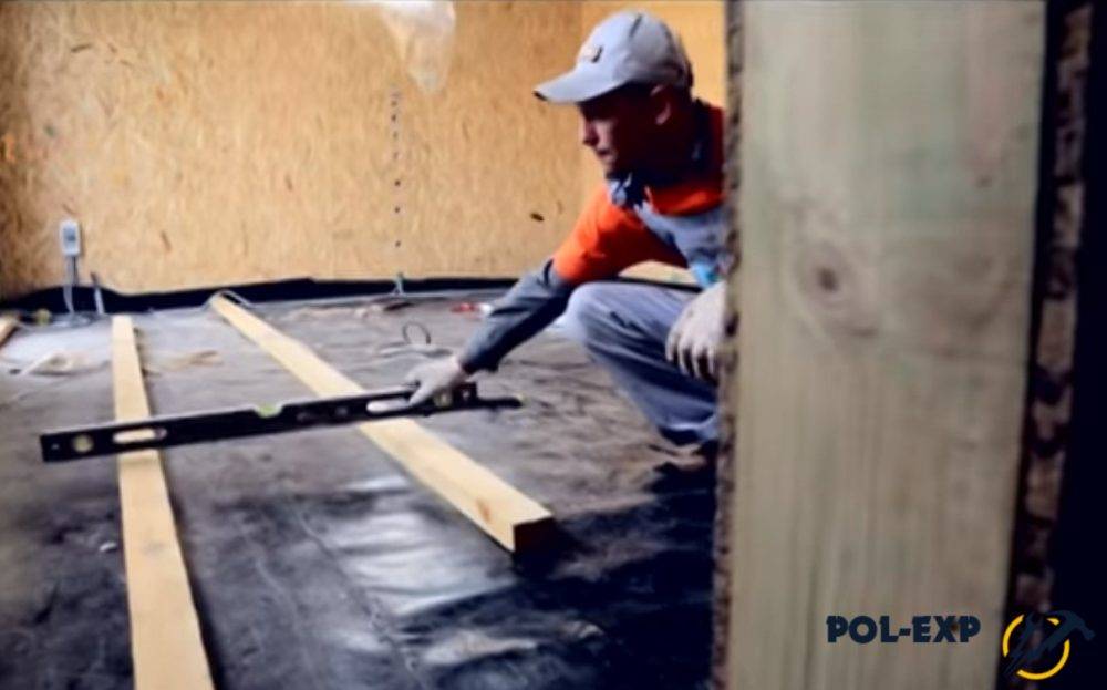 Шаг 2. Далее требуется установить лаги для пола. Они представляют собой в данном случае деревянные брусья, на которые впоследствии будет опираться пол под ногами. Лаги нужно использовать только из сухого дерева. Фиксацию лаг на основании можно произвести при помощи дюбелей. Шаг между лагами может быть равен ширине листа пенопласта.