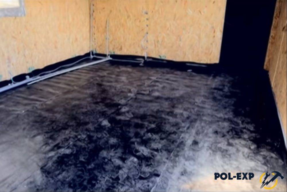 Важно помнить, что пенопласт не терпит кривого основания. Далее укладывается гидроизоляционный слой. В данном случае используется рулонный материал, который укладывается отдельными полосами с нахлестом друг на друга