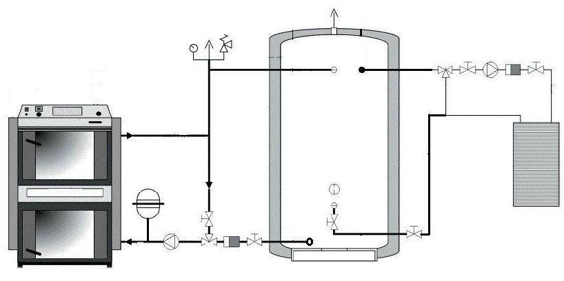 Схема отопления с буферным баком-аккумулятором тепла, и твердотопливным котлом