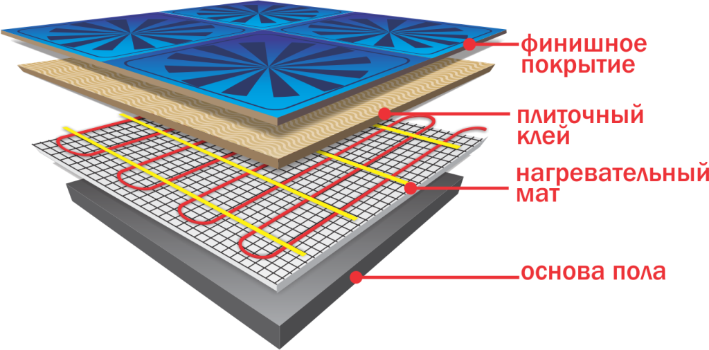 Вторая особенность нагревательных матов для пола, это невысокая мощность греющего кабеля. Из-за этого толщина мата незначительна и практически не влияет на конструкцию пола.