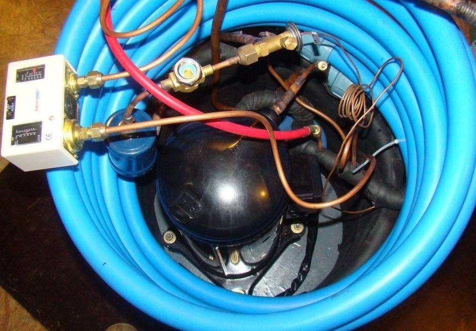 Перед сборкой конденсатора необходимо медную трубку намотать в виде спирали и поместить в металлическую бочку емкостью не менее 0,2 м³. Медная трубка заполняется фреоном, а бочка с водой подключается к системе отопления дома.