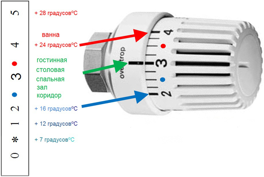 пользователь выставляет необходимое значение температуры воздуха в комнате, для чего на приборе имеется шкала с делениями (например, 21 градусу обычно соответствует значение 3);