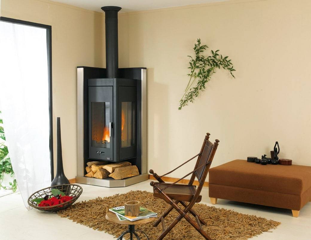Основная особенность этих печей – компактность и высокая скорость нагрева. Металлическая угловая печь-камин представляет собой отопительный прибор с топкой, закрытой огнеупорным стеклом. В зависимости от модели такая печь может быть оснащена плитой для приготовления пищи и баком-теплообменником для подключения контура водяного отопления. К достоинствам таких печей можно отнести: