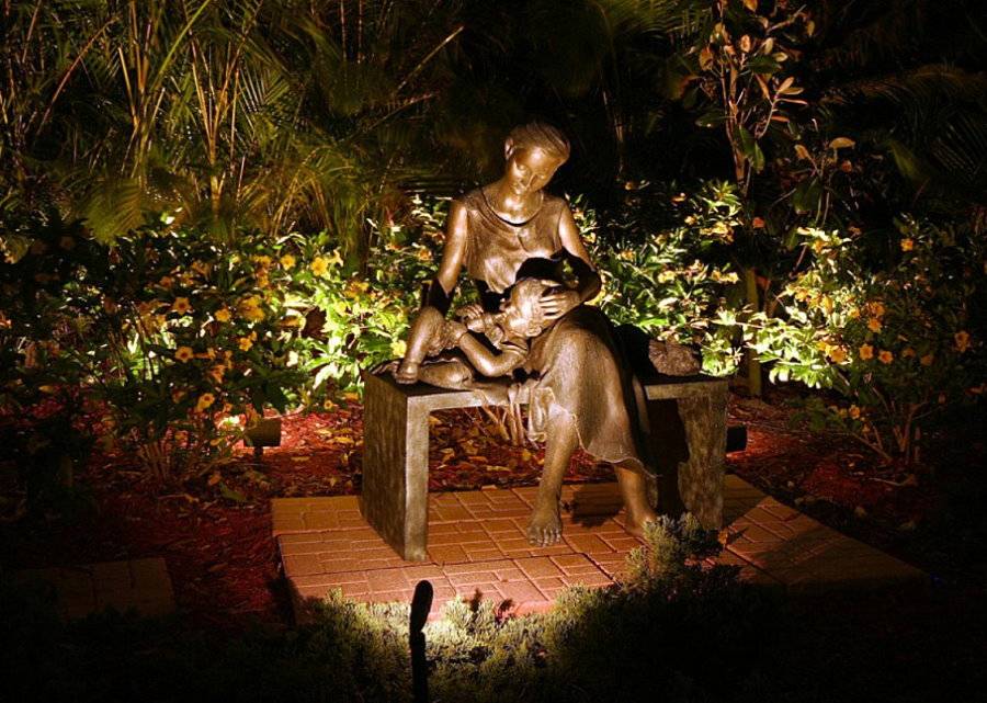 Самый быстрый способ создать эффектную подсветку садовой скульптуры – расположить поблизости фонарики на солнечных батареях