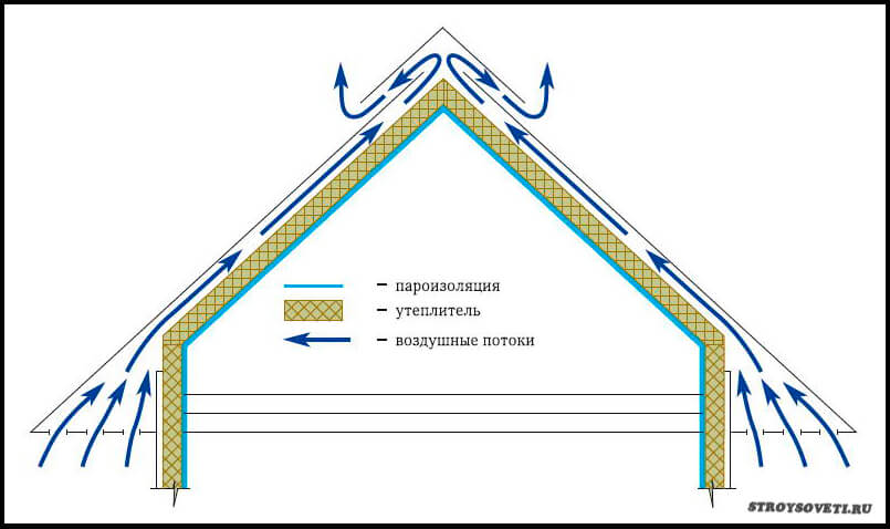 Сквозь слои утеплителя следует провести вентиляционное отверстие диаметром не менее 2 сантиметров. Оно необходимо для выведения пара и конденсата с пароизоляционной мембраны. Эти отверстия проделывают как в верхней, так и в нижней частях на скате кровли. Таким образом, воздух идет снизу вверх вдоль отверстия, собирая по пути лишнюю влагу с пароизоляционной пленки и выводя ее через верхнее отверстие наружу.