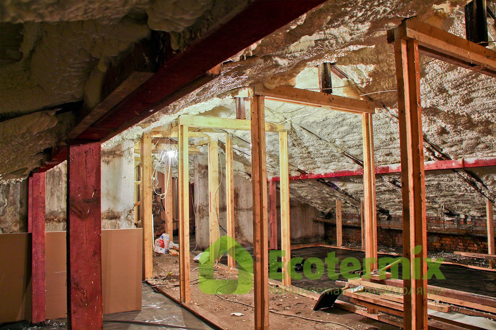 В процессе напыления Экотермикс обрабатывают даже труднодоступные участки вокруг балок. Без применения специальных клеевых составов утеплитель надежно фиксируется на наклонной поверхности, не допуская подвижек. Благодаря закрытой пористой структуре пенополиуретан отличается высочайшими изоляционными характеристиками, соответствующими СНиП.