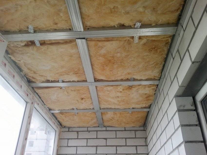 - Утепление потолка происходит по такой же технологии, правда вместо гипсокартона можно использовать подвесной потолок и спрятать под ним всю необходимую проводку для освещения балкона.