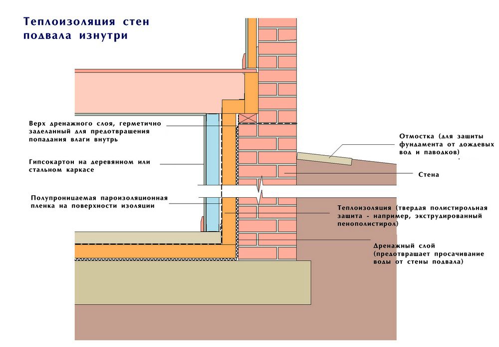 Теперь подробней рассмотрим вариант, когда грунт вокруг подвала сухой, и имеется необходимость утеплить подвал, а сделать это целесообразно только изнутри.