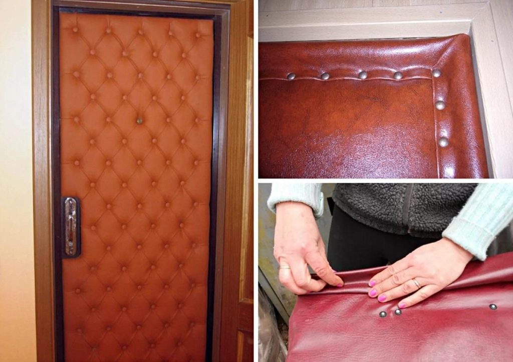 - Дверь, обшитую утеплителем, накрывают сверху дермантином или кожей.