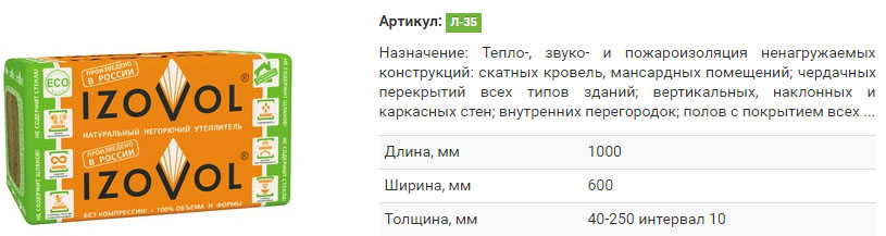 Плиты IZOVOL Л-35 изготовлены из минеральной ваты, состоящей из базальтового волокна и синтетического связующего, повсеместно применяются в ненагружаемых конструкциях: скатные кровли, чердачные перекрытия, внутренние перегородки, полы с покрытием всех типов по несущим лагам, вентиляции и отопления, технологического оборудования.