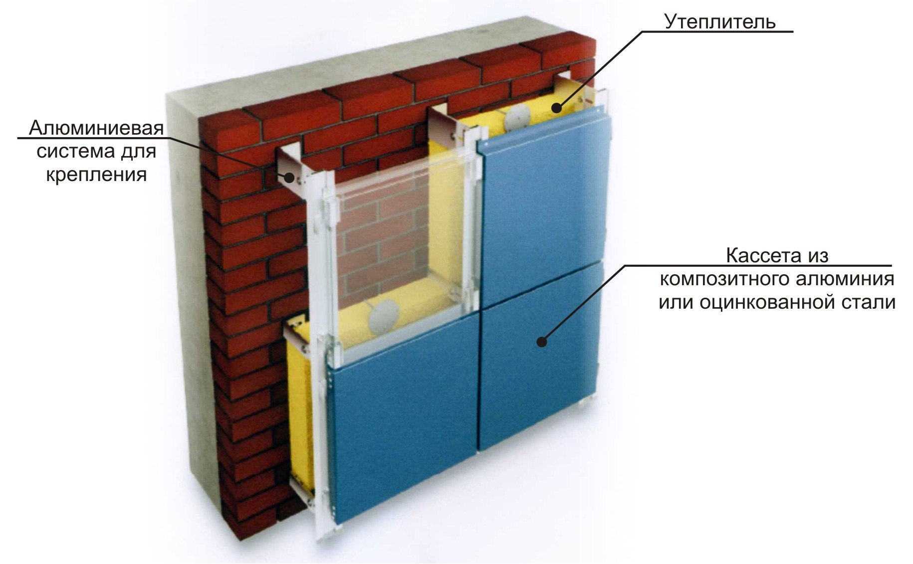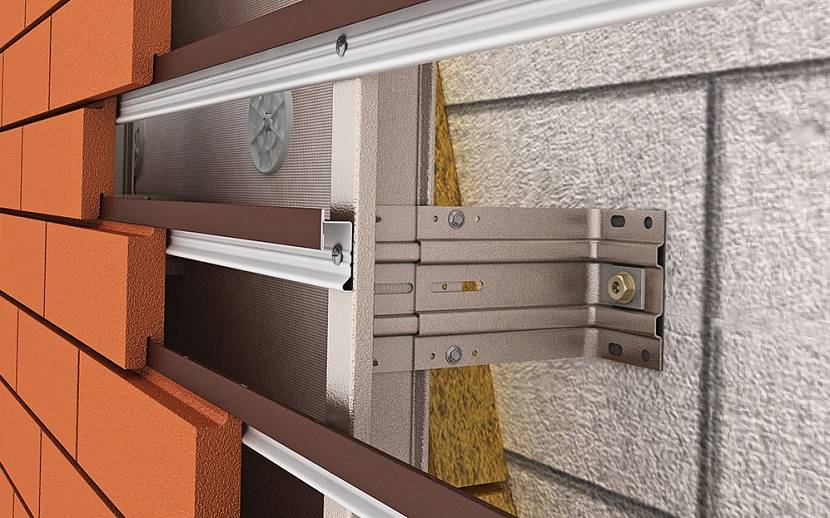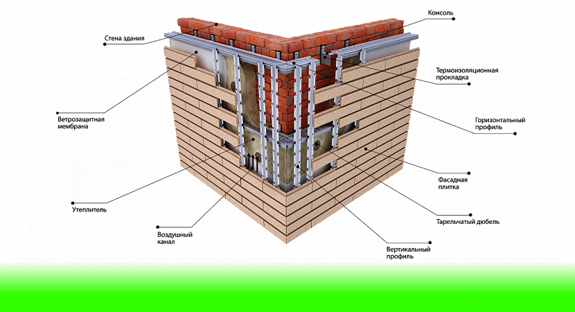 Вентилируемый фасад состоит из теплоизоляции, креплений и облицовочных плит. Несущей основой фасада являются элементы, которые обеспечивают крепление материала для облицовки. К таковым относятся вертикальные и горизонтальные направляющие, кронштейны и другие комплектующие. Между теплоизоляцией и облицовочным материалом образуется пространство, величина которого зависит от длины кронштейнов. Плита-утеплитель плотно крепится к стене при помощи кронштейнов и дюбелей. Надежная несущая основа фасада, как правило, изготавливается из нержавеющей стали или алюминия.