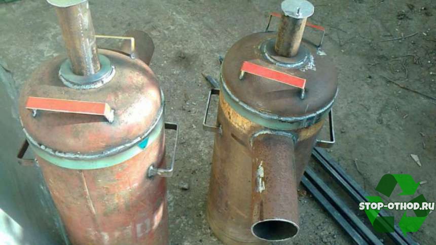- Срезать закруглённую часть баллона, получив корпус и крышку. Отшлифовать места среза болгаркой. Сбоку вырезать загрузочное отверстие для подачи топлива.