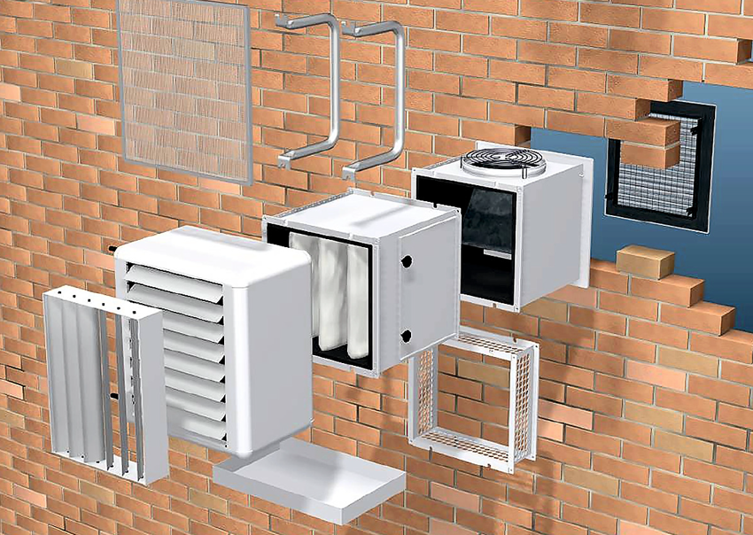 По конструкции выделяют моноблочные и монтажные. Первые состоят из одного блока, устанавливаемого на входе в вентканал. Их используют при монтаже приточки в стене или в оконной раме.