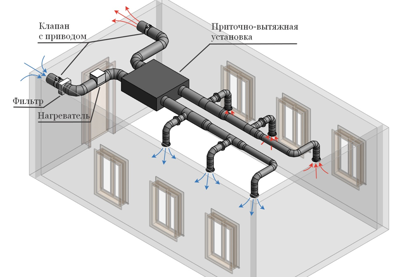 Центральная вентиляция используется в том случае, если необходимо снабжение чистым воздухом большого помещения. Она имеет высокую производительность.