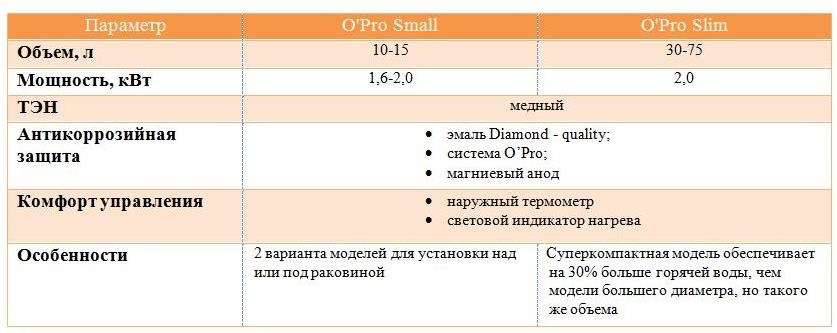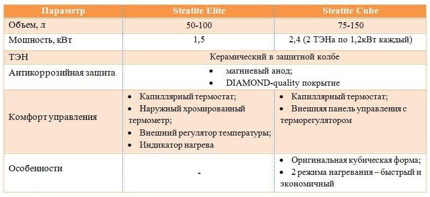 Укомплектованы водонагреватели накопительного типа двумя видами ТЭНов: мокрый и сухой. Первый напоминает кипятильник, а второй не контактирует с жидкостью. Мокрые тэны подвержены коррозии, накипи, для этого концерн разработал серию – O’Pro, которая защищена от ржавчины и других негативных воздействий, связанных с долгим пребыванием в воде. Сухие служат дольше, так как ограждены от жидкости колбой, кроме того, бесшумные ТЭНы товарной линейки Steatite отлично нагреваются. Цены на такие нагреватели немного выше обычных.
