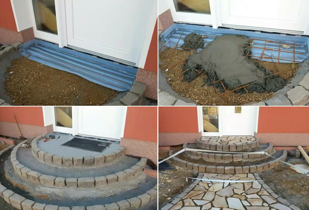 Очень удобно, когда ступеньки располагаются по кругу от основной площадки. Обычно этот прием используется в строительстве маленьких, невысоких крылечек, когда надо обеспечить вход с трех сторон.